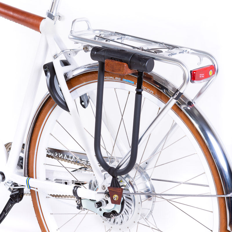 Custom crafted U-lock holder in Swedish oak, with leather detail.